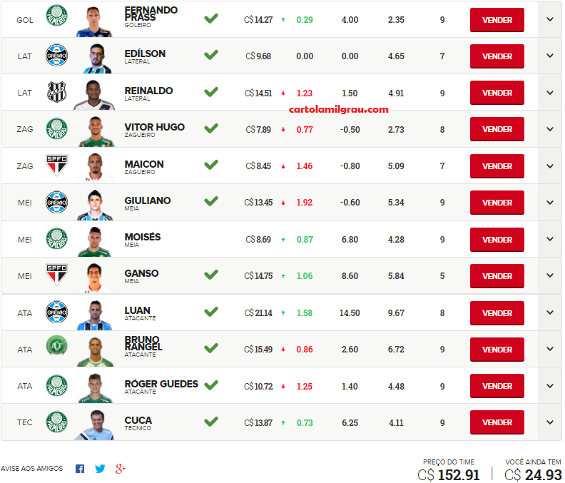 Mais escalados | Dicas da rodada | Cartola 2025
